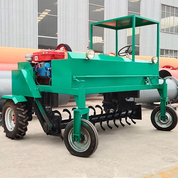 自走式翻堆機是生產生物有機肥專用成套設備中的主機,該機采取四輪行走設計,可前進、倒退、轉彎,由一人操控駕駛。行駛中整車騎跨在予先堆置的長條形肥基上,由機架下掛裝的旋轉刀軸對肥基原料實施翻拌、蓬松、移堆,車過之后篡成新的條形垛堆。即可在開闊場地,也可在車間大棚中實施作業。該機一大技術突破在于整合了物料發酵后期的破碎功能。隨著物料逐漸脫水,加裝破碎裝置的刀軸可有效地破碎肥料在發酵過程中形成的板塊,不僅省去了一臺粉碎機,更主要的大大提高了粉碎的效率,降低了成本。