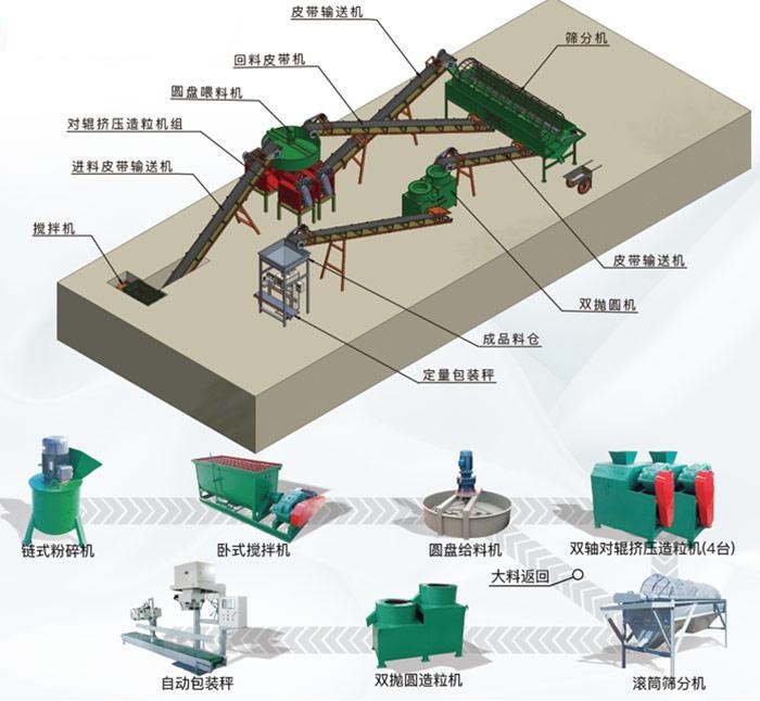 臥式攪拌機→鏈式破碎機→對輥擠壓造粒機→滾筒篩分機→成品料倉→電子定量包裝秤。